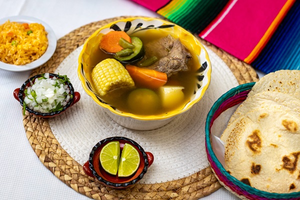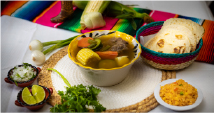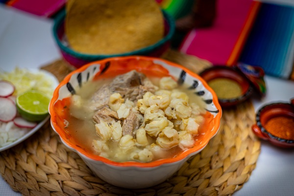 Made from scratch corn, pork. On a side onion, radishes, repollo, fresh lemon and tostadas.