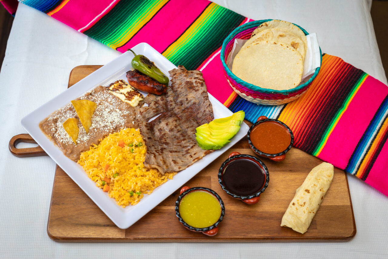 Beef cecina, chorizo piece, chile toreado, queso fresco, avocado, rice, beans and tortillas.
