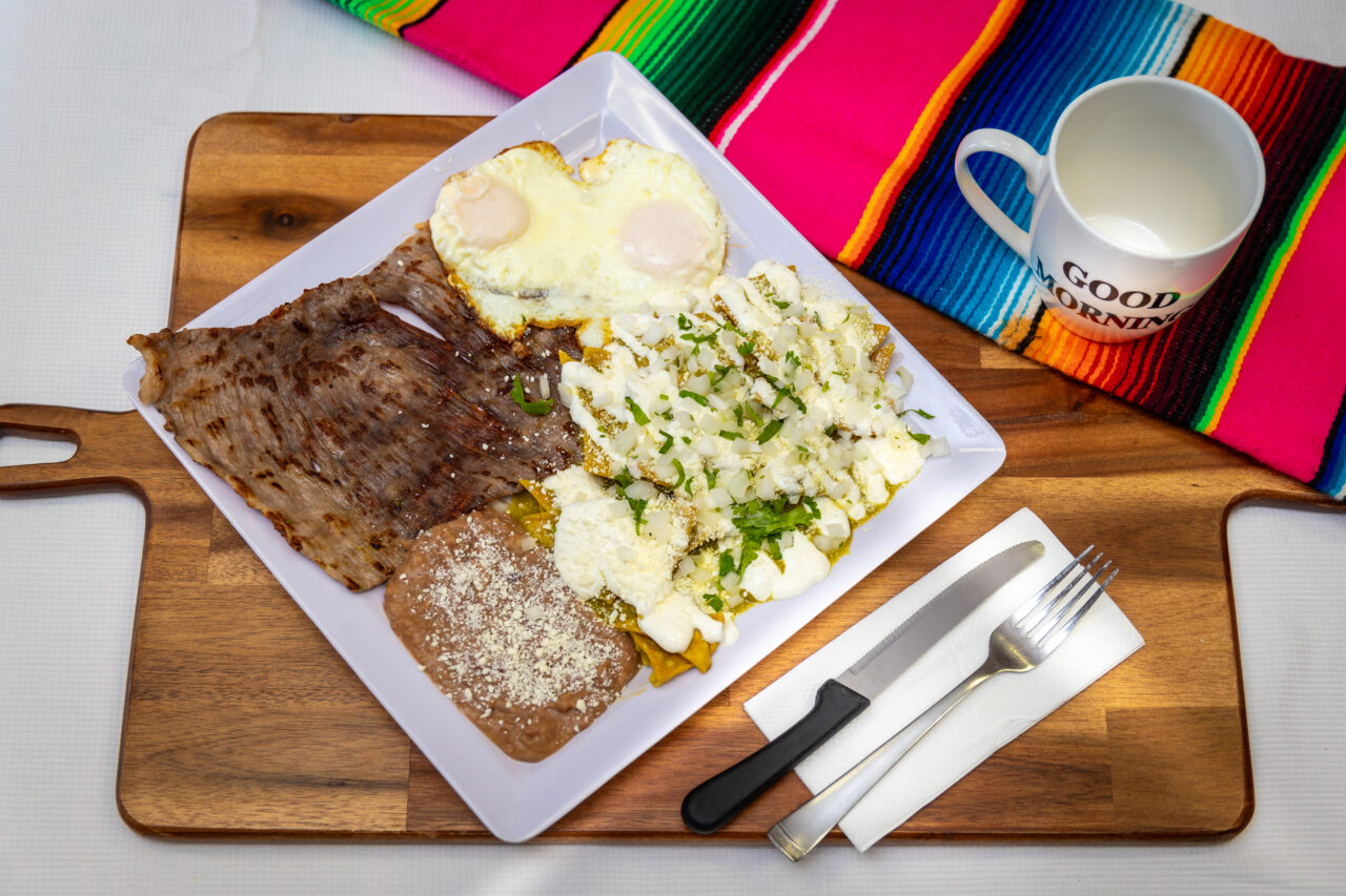 Red / green sauce w/eggs your choice, beans, raw onion, cilantro, sour cream and cheese.