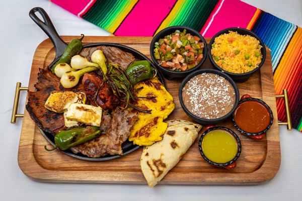 Ranchera meat, chicken breast, cecina, rice, beans, cactus salad, tortillas and salsas.